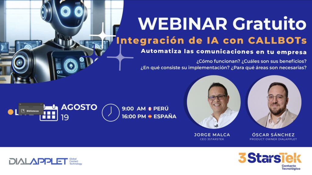 No te pierdas nuestro Webinar gratuito sobre cómo integrar tecnología IA a tu empresa a través de Callbots, este lunes 19 de agosto a las 9 am.